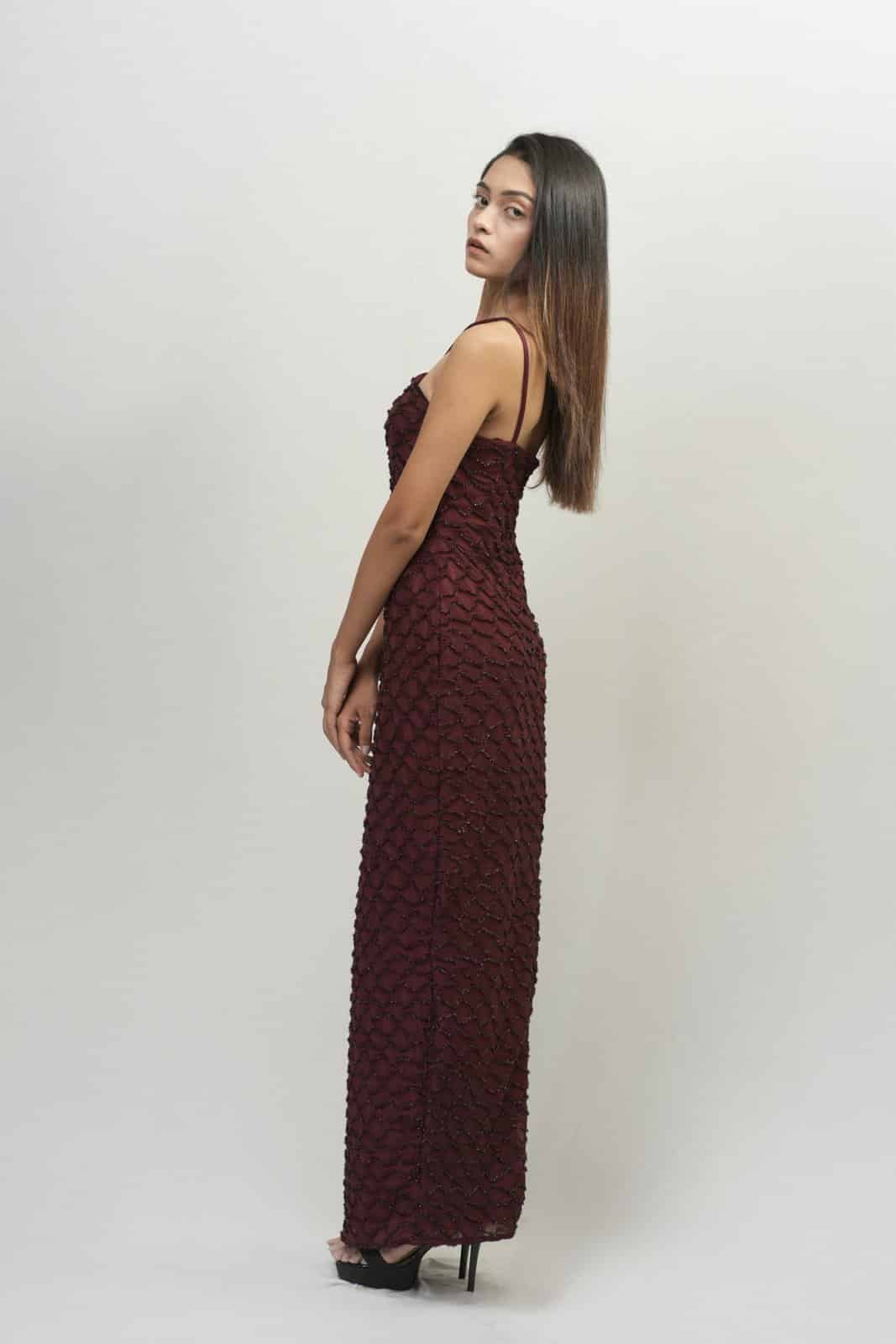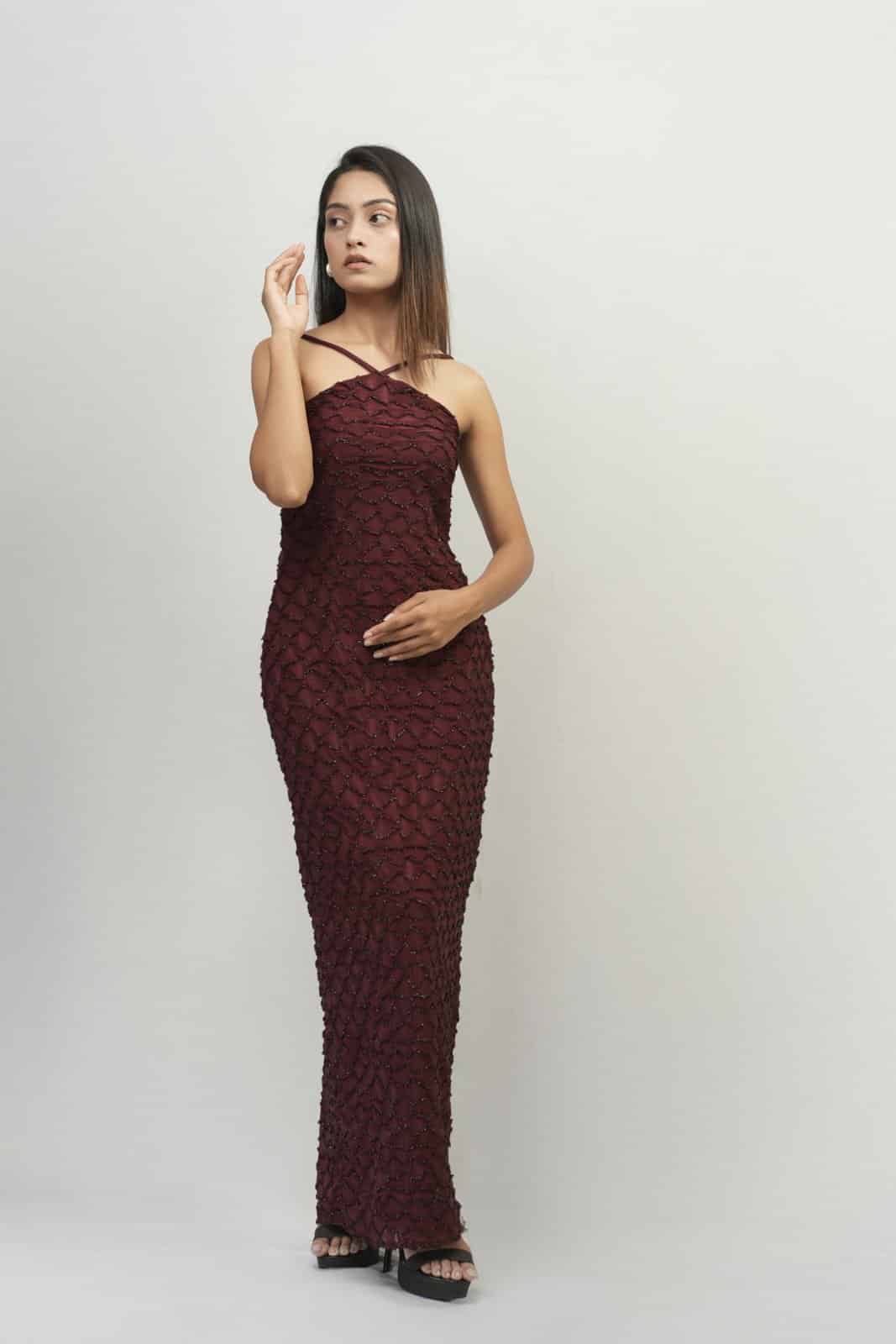 Sizzle in this stunning maroon bodycon dress, featuring a sultry cross-neckline and shimmering fabric. Hugging curves in all the right places, this floor-sweeping gown showcases a sleek, high-shine finish. Perfect for evening events or nights out, pair with heels and statement jewelry for unforgettable glamour.